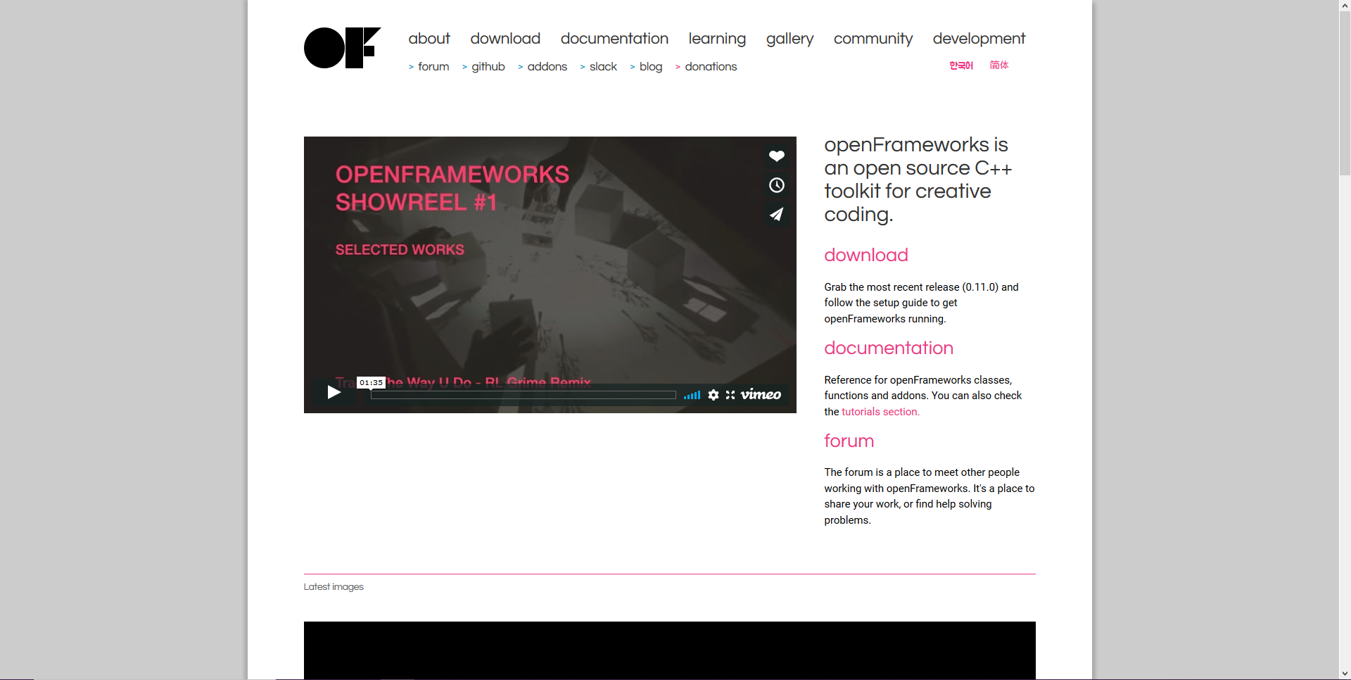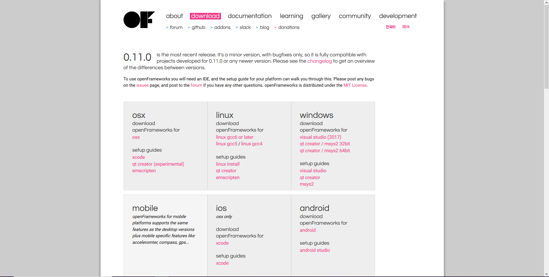 일단 아래의 링크로 들어가주세요(openframeworks 홈페이지)