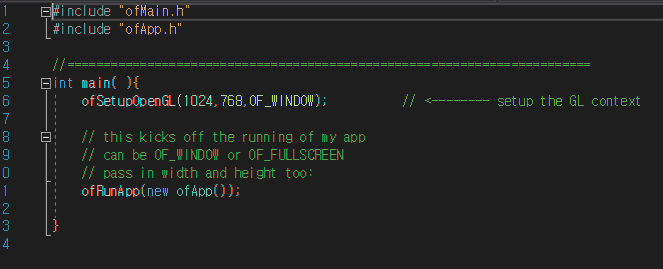 main.cpp는 프로그램이 시작되면 ofApp.cpp를 실행하는 역할 정도로 보고 계시면 됩니다